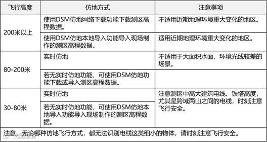 为方便大家记忆,可参考下图表格中的内容,选择仿地飞行方式。注意,无论哪种仿地飞行方式,都无法识别电线这类细小的物体,请时刻注意飞行安全。