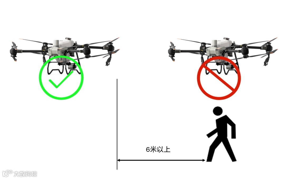 在飞行时,时刻与人保持6米以上安全距离,不可在人员上方飞行。如有人接近正在飞行中的农业无人机,则必须主动避让。如发现农业无人机飞行姿态不稳定,则应迅速清空周围人员,快速降落。