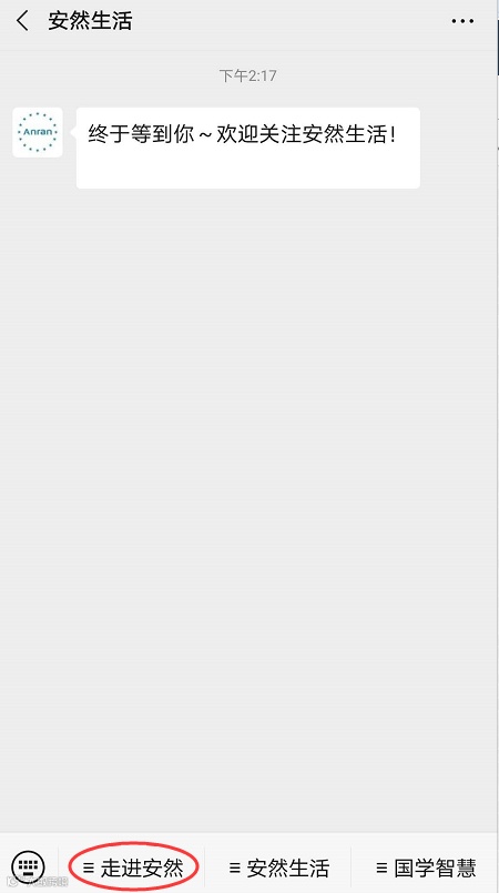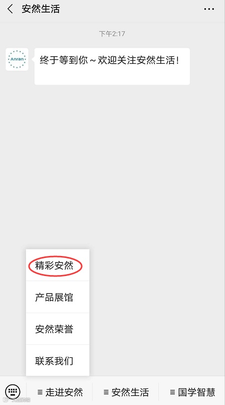 1.关注【安然生活】微信公众号,点击菜单[走进安然]—[精彩安然]进入官网。