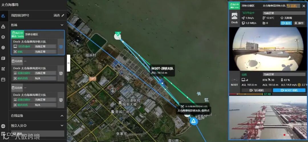 随着“嗡”的一声机鸣,固定在太仓海事浏河海巡执法大队江堤上的“机库”缓缓打开双门,库内无人机迅速升空,按照设定航线开始新一轮巡航。