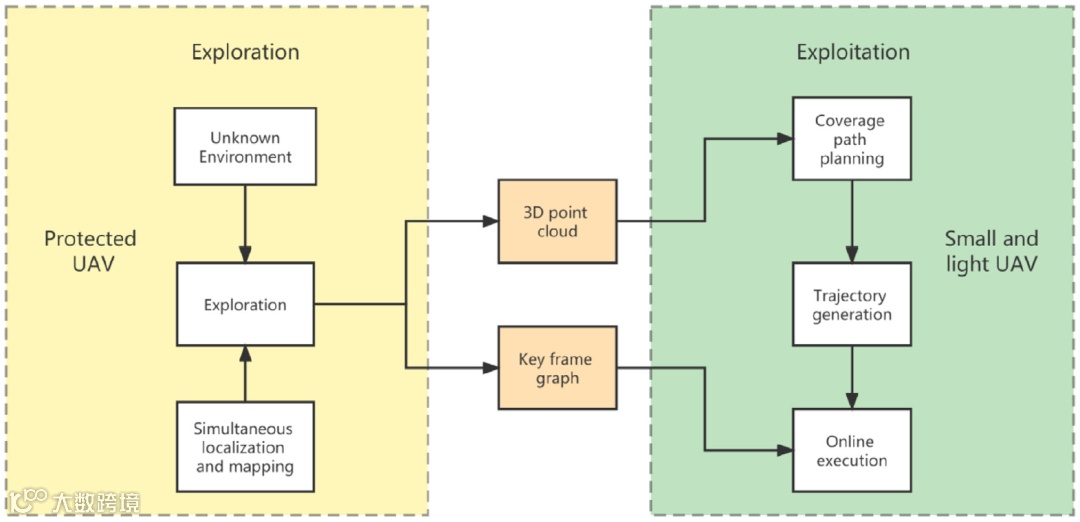图1显示了所提出的先探索后利用系统的架构。受保护的无人机用于探索未知环境,并构建可用于开发步骤的3D地图和关键帧图。小型轻型无人机用于对目标区域进行覆盖路径规划,并按照生成的轨迹获取有关设施的详细信息。