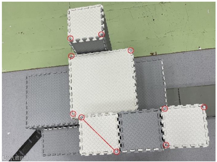 如图8所示,我们在设施上放置了一些标记并测量每个标记之间的距离。最后,我们得到 45 个测量距离,并将它们与重建模型中的相应距离进行比较。