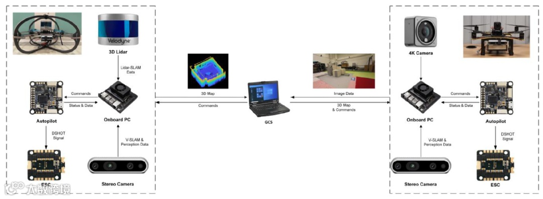 如图2所示,所提出的系统由两架功能不同的无人机组成。因为环境未知,最大的挑战是保证飞行安全。因此,我们参考Petris等人设计了一种受保护的无人机。选择3D激光雷达作为激光SLAM的设备,以实现在未知环境中的鲁棒定位和映射。立体相机用于构建开发步骤的关键帧图。