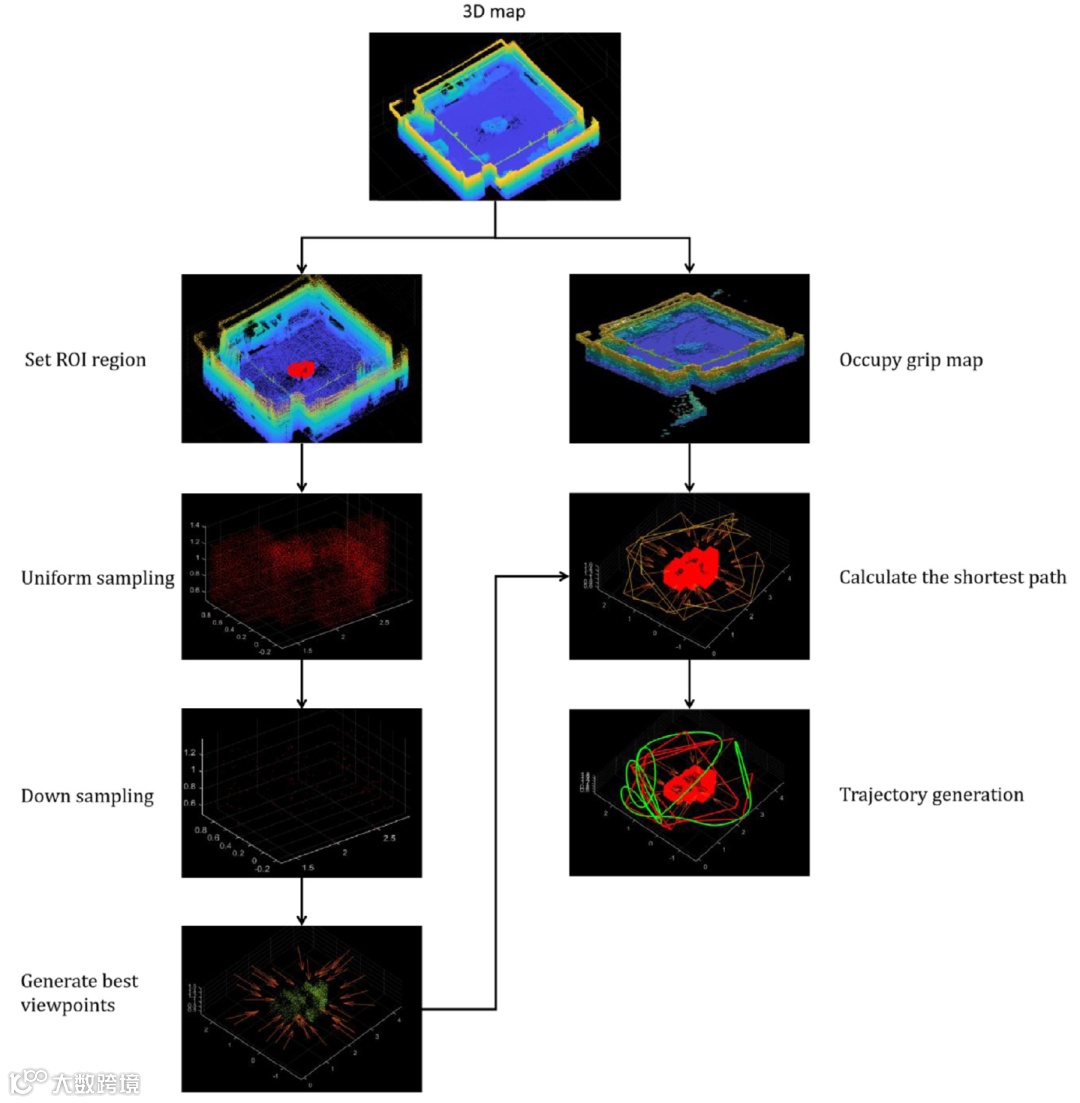 在室内应用中,没有GPS信号。为了实现自主飞行,需要定位系统为无人机提供位置信息。通常,UWB和VICON用于提供位置信息。但是,这些都是外部定位设备,很难在新环境中部署这些设备。为了获得高质量的图像,拍摄点与设施之间的距离应满足检查要求。然而,飞行安全需要保证,在确保飞行路径没有障碍物的同时获得最短路径并不容易。此外,在障碍物密集的室内环境中,生成动态可行的轨迹以遵循路径可能具有挑战性。它对无人机灵活调整主路径以避开障碍物同时满足动态限制提出了很高的要求。针对上述难点,提出一种基于无人机的高效探索后利用系统,可用于室内数据采集。该系统保证了目标设施的覆盖范围,无人机与障碍物之间的防撞以及飞行安全。