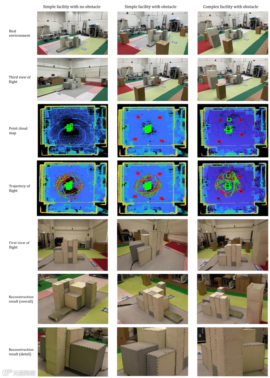 为了详细说明所提出的探索后利用系统,我们在没有外部定位设备的室内环境中进行了几次现场实验。分别测试了所提SLAM系统的精度和稳定性、所提轨迹生成方法的鲁棒性以及整个系统的性能。实验在8.4米长,6.0米宽,6.0米高的环境中进行。图6显示了实验室环境的详细信息,激光雷达SLAM的3D地图,生成的轨迹,工作场景以及重建结果的整体和详细特征。