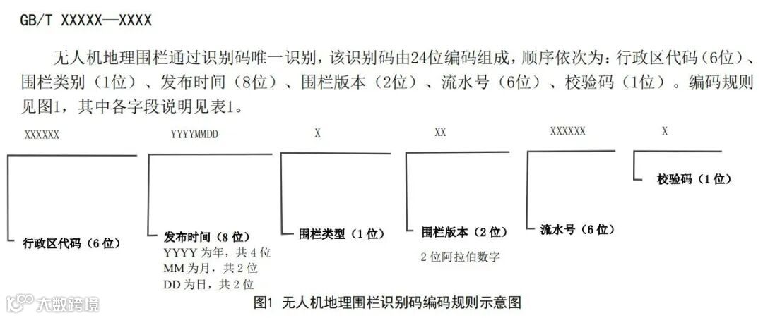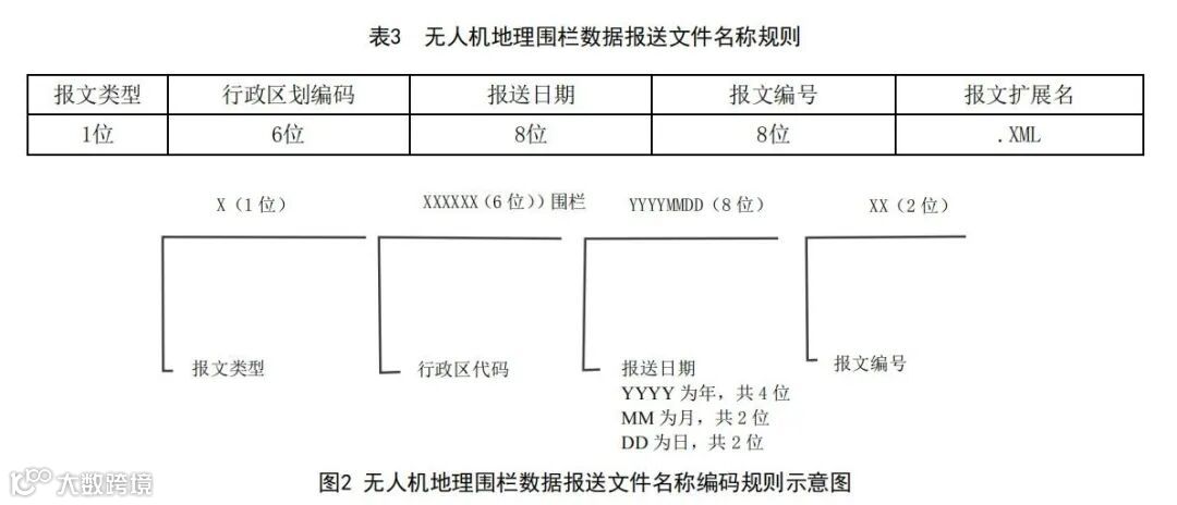 数据管理要求方面,规范阐明了服务相关方(用户)可以是与系统交互的个人、组织、或机构等,内容可包括其相应系统。对用户为信息发布方、数据汇集方、地理围栏数据查询者、地理围栏数据获取方、地理围栏服务方作出了明确的定义。数据服务应至少具备发布服务、查询服务、获取服务、地理围栏服务和同步服务的功能,并详细阐述。对数据清洗的定义及功能进行了详细解释。数据校验应采用MD5等校验技术。数据更新包括地理围栏的数据更新以及地理围栏数据服务更新,并阐明了定义及应满足的要求。数据发布的解释是在有无人机地理围栏数据更新时,无人机围栏管理部门应及时向管理平台报送无人机地理围栏数据。数据文件需要以XML格式报送。文件可包含多个无人机地理围栏单元数据记录。对文件名称的编写规则作出了相应的规范: