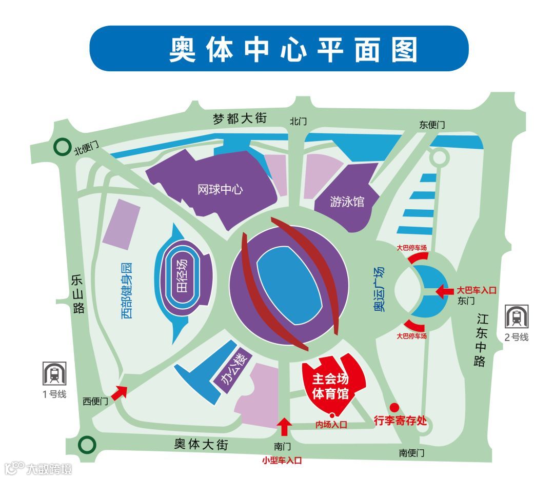 其中大巴车东门入,奥运广场前两侧为大巴车停车场;私家车可南门入。行李寄存处位于奥体中心东南方向。