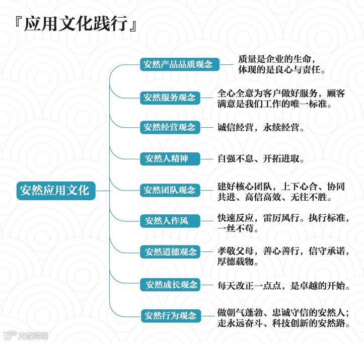 安然自创立至今,一直致力于人们的健康长寿、事业永恒和幸福永恒,并为此搭建了广阔的事业平台,希望员工和伙伴秉承仁愛、感恩、诚信、利他、良知的安然价值观去开拓属于自己的事业天地,在获得福禄寿三圆满的安然人生的同时,帮助大众获得健康,积极建设他人的心灵品质,为社会带来价值。