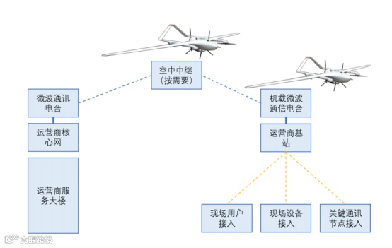 通讯数据链产品与长航时无人机平台等核心技术,结合多种功能外设实现整体系统设计。主要应用微波通讯技术、自组网技术、中继技术、无人机空中平台技术等,重点解决受灾地区公网通讯紧急恢复,同时扩大附加能力使得复杂环境下支持更大通讯范围覆盖,支持搜救人员生命体征定位信息实时回传,维持群众基本对外通讯支持等。
