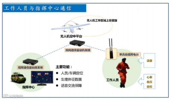 利用长航时大载荷无人机、远距离通讯及中继通讯、无中心自组网电台等产品组成通讯系统。可在自然灾害中实现一体化的公网通讯临时维持,以及在救援中维持救援力量的通讯,有效解决通讯失效的问题。