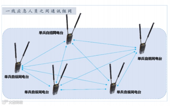单兵自组网电台可以通过配置,使多个相同设备实现自行组网,构成一线应急人员之间通讯组网。网内设备可以根据一定规则实现数据相互传输,互联互通。