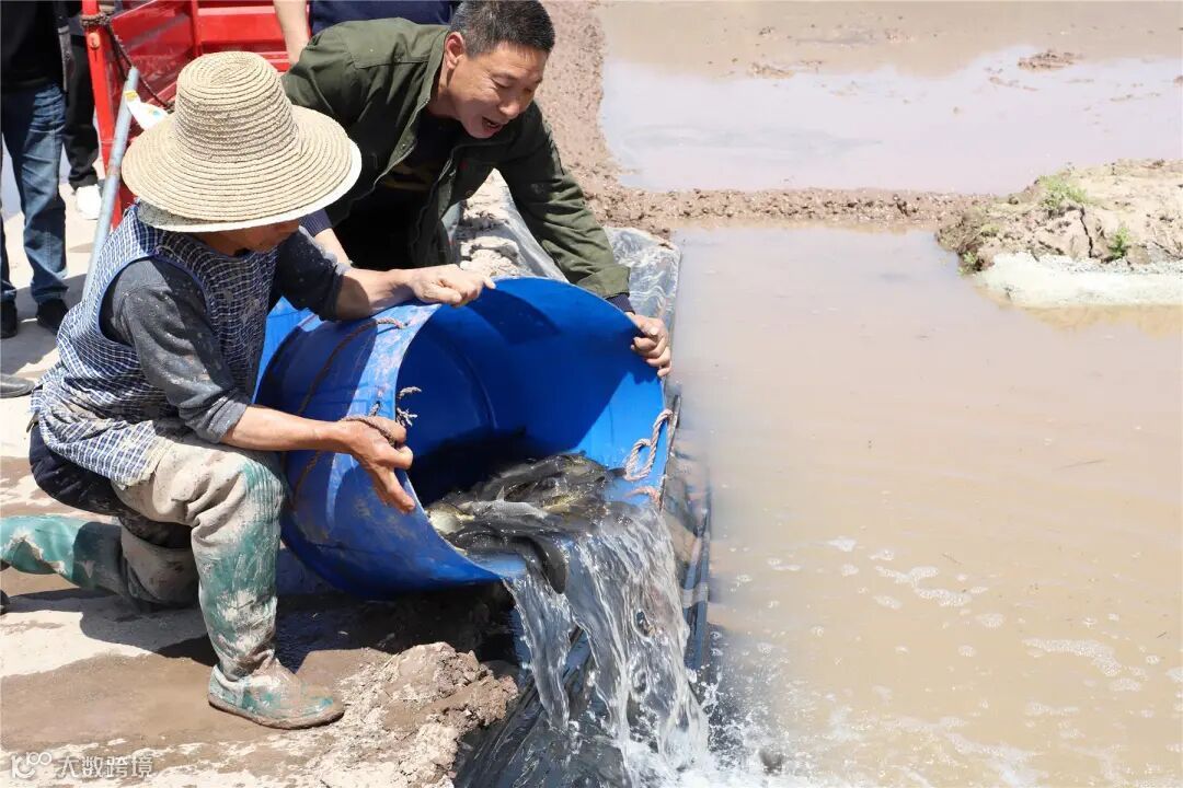 另一稻田边,两位村民正将刚刚拉来的鲫鱼,小心翼翼地放到稻田一隅的小塘里,不久后将鱼苗放入稻田里。