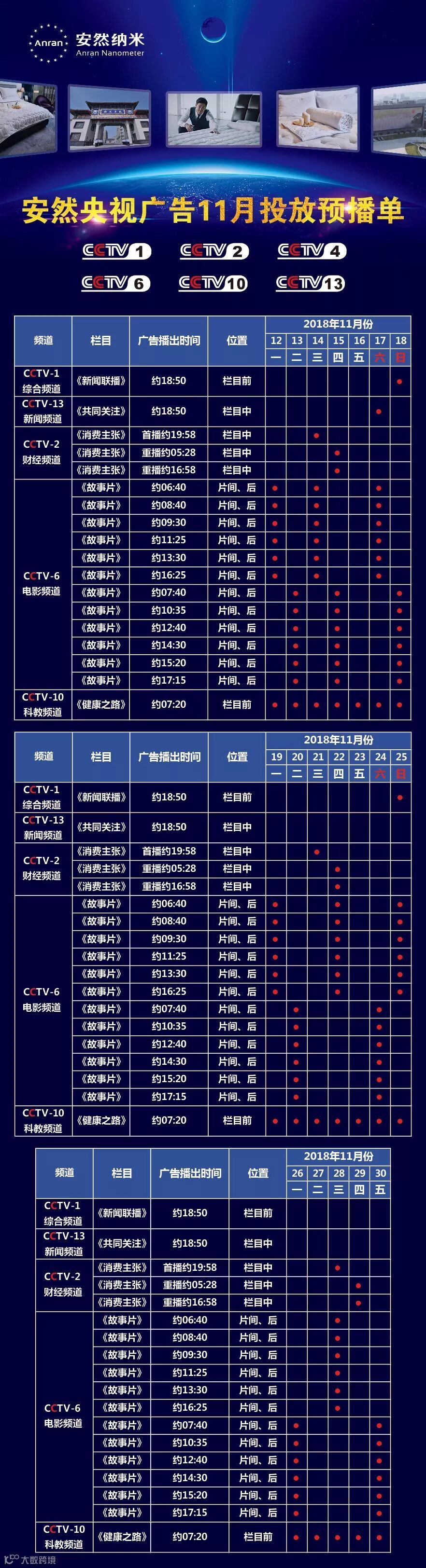 接下来,安然品牌广告还将在CCTV-1《新闻联播》、CCTV-2《消费主张》、CCTV-4《中国新闻》、CCTV-13《共同关注》等多个频道、多个时段陆续播出。