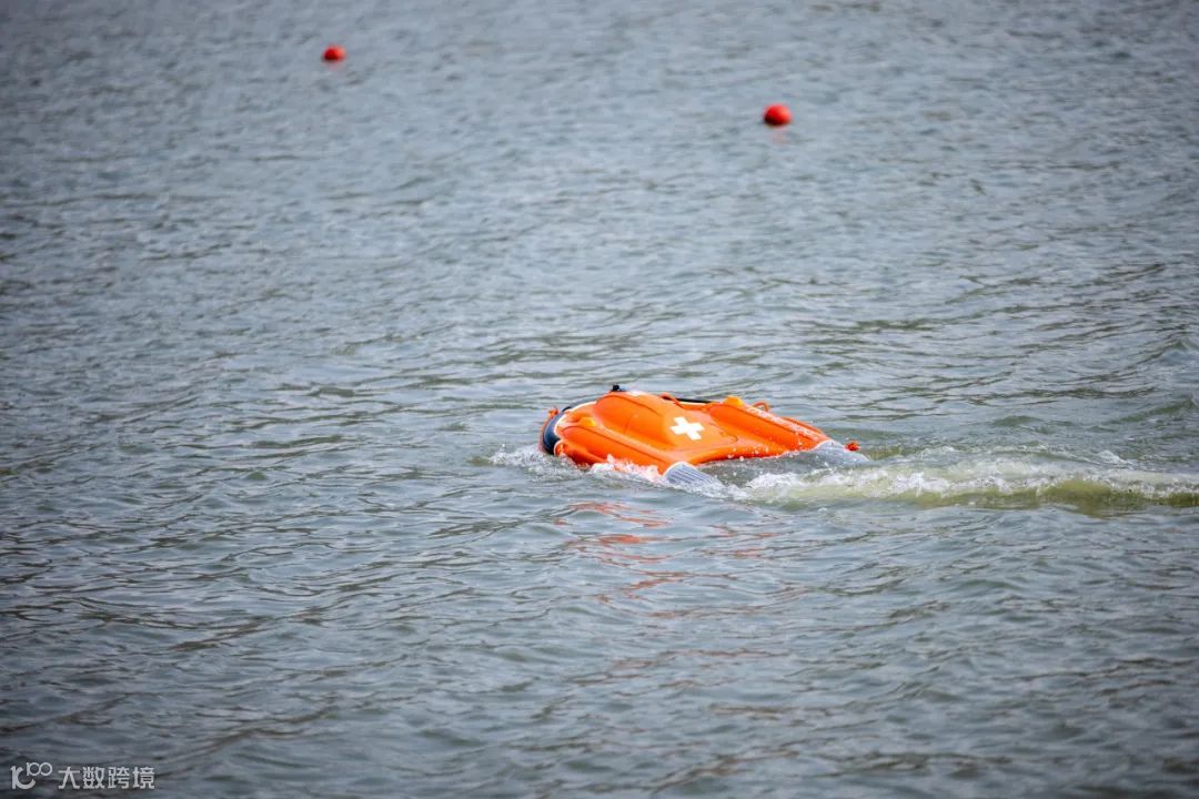 “海豚1号”水面救生机器人是一款远程遥控操作的智能化救援设备。自重13公斤,可随意抛投,航行速度3米/秒;拖拽力大,可承重150公斤,同时拖拽3个成年人也毫无压力,最长遥控距离可达800米;遇到险情时,只需将救生机器人抛掷水面,即可快速、精准航行至落水人员身边,将其拖拽到安全区域,全过程救援人员无须下水,只要在岸边或船上遥控施救。