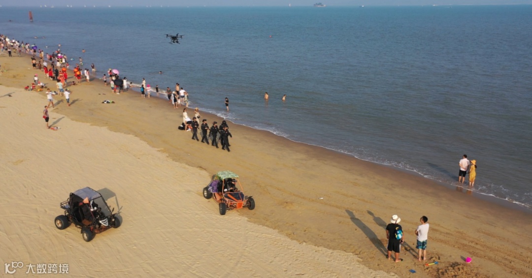 5G网联无人机对沙滩巡查,提醒游客勿离岸线太远,核查岛礁是否有游客滞留