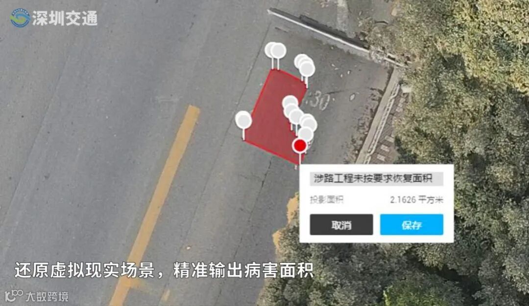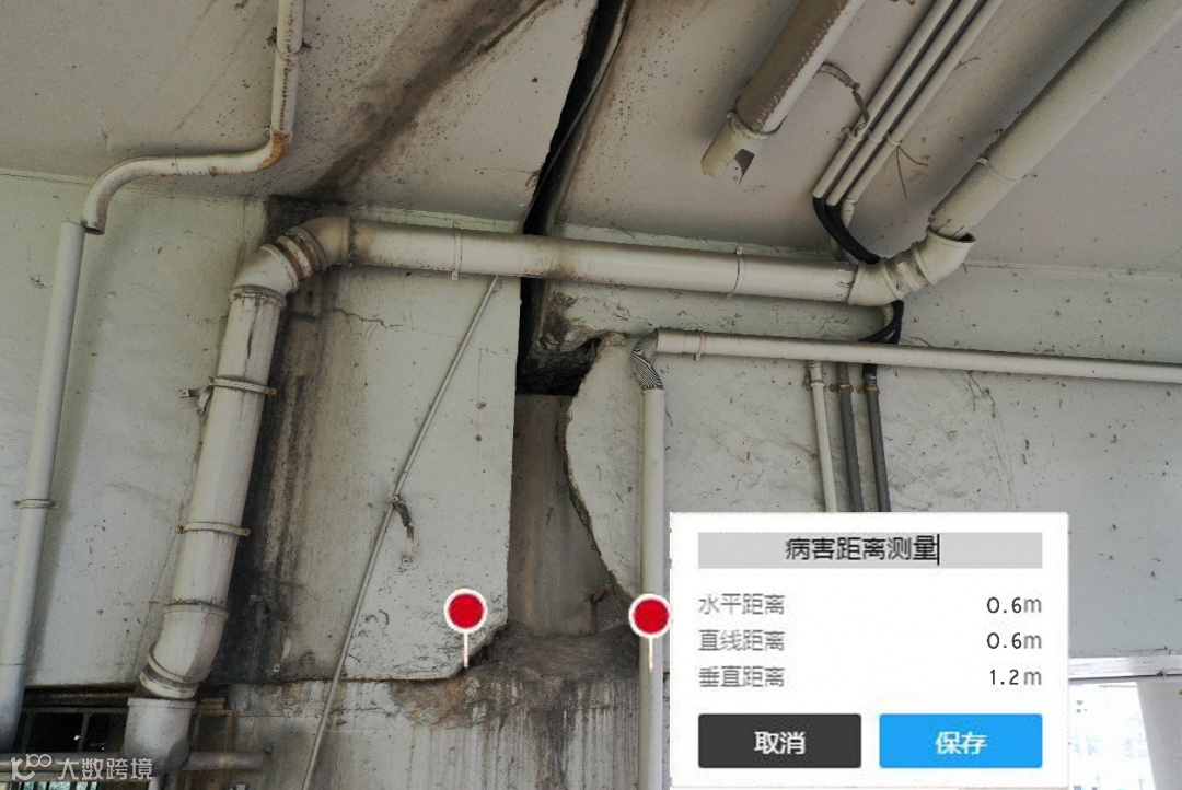 通过后台工程师逐一校对,输出病害数量及厘米级尺寸、长度、高差、面积等数据,进行无死角、厘米级定位,为后续准确、高效修复病害提供数据支撑。