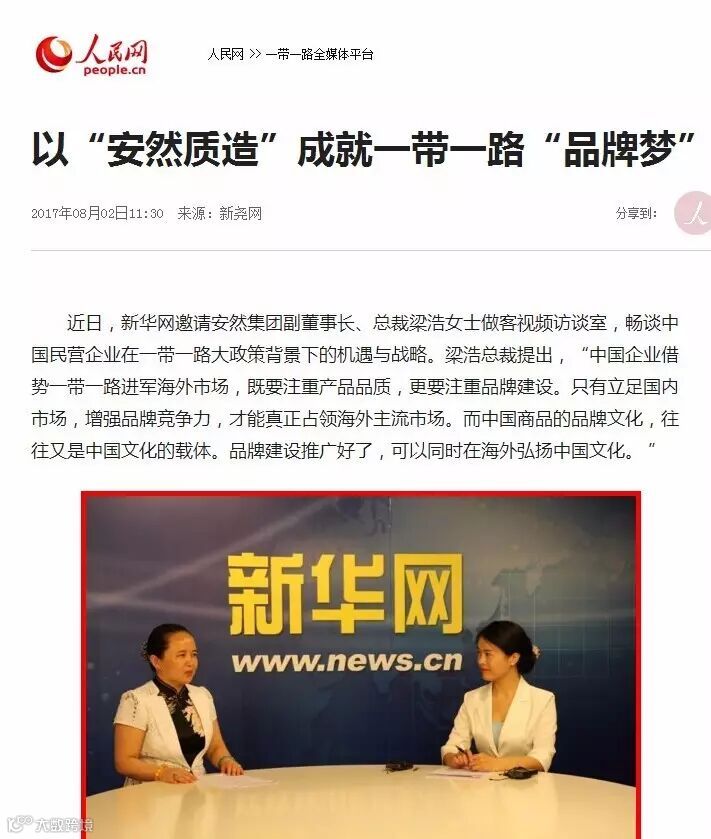 日前,安然公司副董事长、总裁梁浩女士受邀走进新华网,做客《新华访谈》节目。在访谈中,梁总就纳米技术和民用化、品牌建设及驱动力等热点话题与主持人互动交流,为广大网友答疑解惑。在重点论述如何讲好安然的品牌故事时,梁总表示安然将紧紧抓住产品质量,坚持科技创新,创立全新运营模式,让安然品牌熠熠生辉。