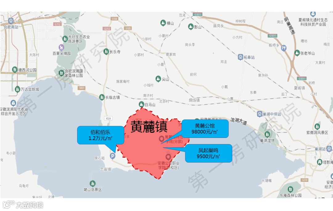 板块有着“合肥后花园”之称,同时也是高校云集的集聚地。但是,他属于巢湖的产证,只是位置在合肥省府的东边方向,实际上跟省府没什么关系。板块宣传最大的亮点是,环境宜居、风景宜人。换一种方式说,就是离市区较远通勤距离较远、配套还有待提升。从下图我们不难看出,黄麓镇到合肥滨湖的直线距离是27KM,到巢湖市区的直线距离是28KM。试想下,如果是在合肥市区或者巢湖市区上班,住在黄麓是什么样一种上班体验?