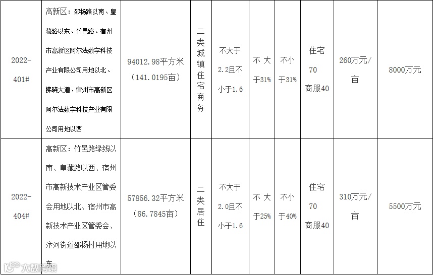 2022-401#地块要求:1、竞买人须为公司法人。2、依据2022年3月15日高新区管委会函:竞得人须在商务用地范围内投资建设符合《宿州市高新区数字特色小镇》产业规划的数字科技产业园。产业园具体的建设标准要求由高新区管委会负责解释。3、竞买人在竞得土地后,住宅用地和商务用地须同时开工建设和统一同步开展规划核实验收工作。商务用地地块在建比例达到规划设计总量的50%后,住宅用地方可办理预售审批手续。该条款由市高新区管委会和市房管中心负责监督落实。4、该地块不接受联合竞买。竞买人参加竞买土地时应提交竞买保证金不属于银行贷款、股东借款、转贷和募集资金的承诺书及金融机构出具的自有资金资信证明。5、市高新区管委会负责解释、审查上述第2、3、4条竞买条件的相关内容,并出具审查合格的证明材料作为竞买报名的条件。6、竞得人须自成交之日起10个工作日内签订项目地块《国有建设用地使用权出让合同》,因竞得人自身原因,逾期未签订的终止供地,竞买保证金不予返还。竞得人注册所在地位于宿州市境外的(属宿州市境内企业,如需在项目所在地辖区内另行注册全资子公司的,须在报名时作出书面申请),须自成交之日起40日内在项目所在地设立一个有法人资格的全资子公司并由其与市自然资源和规划局签订《国有建设用地使用权出让合同变更协议》,竞得人及其全资子公司对宗地出让文件、《国有建设用地使用权出让合同》及《国有建设用地使用权出让合同变更协议》的权利、义务互负连带责任。7、竞买人在办理竞买登记手续时,须书面承诺“已认真阅读该宗地相关出让文件并自愿受其约束,对土地现状充分了解无异议,愿意在约定时间内现状接受土地,签订《国有建设用地交付确认表》,不对宗地现状交付和相关出让文件有异议或提出抗辩”。8、竞买人竞得土地后,须按规划条件通知书、《宿州市控制性详细规划通则》和出让合同约定的容积率进行开发建设,不得擅自改变,否则视为违约,超容积率部分无偿收回。9、竞得人可以选择分期付款方式支付土地出让金,竞买保证金直接转为首期土地出让金且首期(合同签订之日起1个月内)缴纳比例不低于总价款的50%,一年内缴清全部出让价款。分期支付出让价款的,竞得人在支付第二期及以后各期出让价款时,须按照支付第一期土地出让价款之日中国人民银行公布的贷款利率,向出让人支付利息;也可以自出让合同签订之日起一个月内缴清全部土地出让金。10、竞得人须自签订出让合同之日起6个月内实质性开工建设,并在开工建设后2年内竣工(主体建筑结构封顶)。11、自签订出让合同之日起7日内由高新区管委会办理土地移交手续,并负责监督受让方将合同条款履行到位。宗地范围内建筑物及其附着物拆迁至室内地坪,其他维持现状,外部条件(道路、水、电、气等)均以现状为准。12、出让土地地上架空线、地下管线、地下障碍物、绿化等均由竞得人按照有关规定负责勘验并自行妥善解决。13、地块内配建的社区用房、养老设施、卫生设施、“结建”的人防工程等建成后产权无偿移交给政府有关部门。