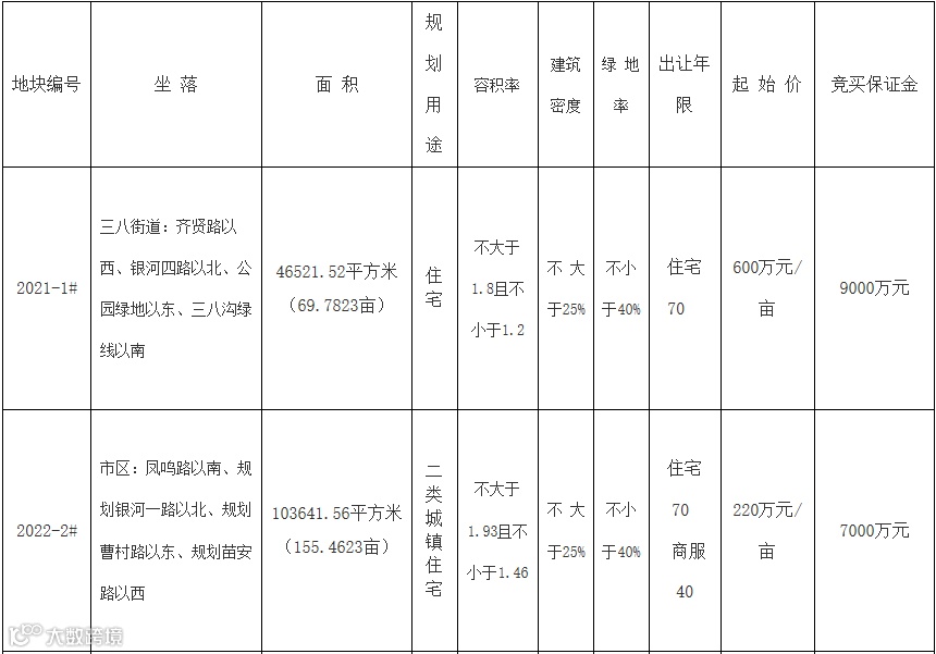 2022-2#地块要求:1、竞买人须为公司法人。2、该宗地需满足城东片区商住综合开发要求,报名时需提供埇桥区人民政府出具的审核确认材料作为竞买申请的依据。3、竞得人须自成交之日起10个工作日内签订项目地块《国有建设用地使用权出让合同》,因竞得人自身原因,逾期未签订的终止供地,竞买保证金不予返还。竞得人注册所在地位于宿州市境外的(属宿州市境内企业,如需在项目所在地辖区内另行注册全资子公司的,须在报名时作出书面申请),须自成交之日起40日内在项目所在地设立一个有法人资格的全资子公司并由其与市自然资源和规划局签订《国有建设用地使用权出让合同变更协议》,竞得人及其全资子公司对宗地出让文件、《国有建设用地使用权出让合同》及《国有建设用地使用权出让合同变更协议》的权利、义务互负连带责任。4、竞买人在办理竞买登记手续时,须书面承诺“已认真阅读该宗地相关出让文件并自愿受其约束,对土地现状充分了解无异议,愿意在约定时间内现状接受土地,签订《国有建设用地交付确认表》,不对宗地现状交付和相关出让文件有异议或提出抗辩”。5、竞买人竞得土地后,须按规划条件通知书、《宿州市控制性详细规划通则》和出让合同约定的容积率进行开发建设,不得擅自改变,否则视为违约,超容积率部分无偿收回。6、竞得人可以选择分期付款方式支付土地出让金,竞买保证金直接转为首期土地出让金且首期(合同签订之日起1个月内)缴纳比例不低于总价款的50%,一年内缴清全部出让价款。分期支付出让价款的,竞得人在支付第二期及以后各期出让价款时,须按照支付第一期土地出让价款之日中国人民银行公布的贷款利率,向出让人支付利息;也可以自出让合同签订之日起一个月内缴清全部土地出让金。7、竞得人须自签订出让合同之日起6个月内实质性开工建设,并在开工建设后3年内竣工(主体建筑结构封顶)。8、自签订出让合同之日起7日内由宿州市自然资源和规划局办理土地移交手续,并负责监督受让方将合同条款履行到位。宗地范围内建筑物及其附着物拆迁至室内地坪,其他维持现状,外部条件(道路、水、电、气等)均以现状为准。9、出让土地地上架空线、地下管线、地下障碍物、绿化等均由竞得人按照有关规定负责勘验并自行妥善解决。10、地块内配建的社区用房、养老设施、卫生设施、幼儿园、“结建”的人防工程等建成后产权无偿移交给政府有关部门。