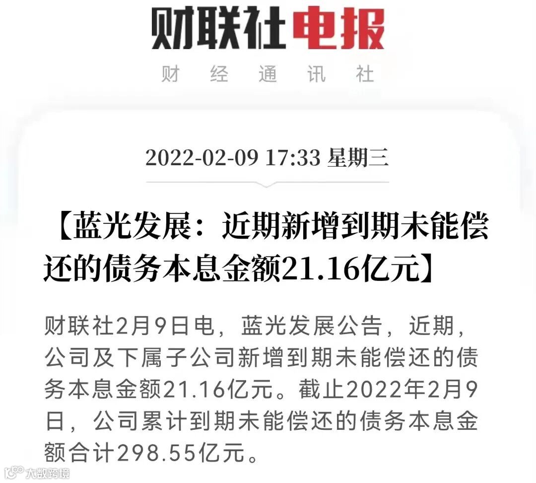 今年2月,蓝光发展及下属子公司新增到期未偿还债务本息金额月21.16亿元,累计负债298.55亿!