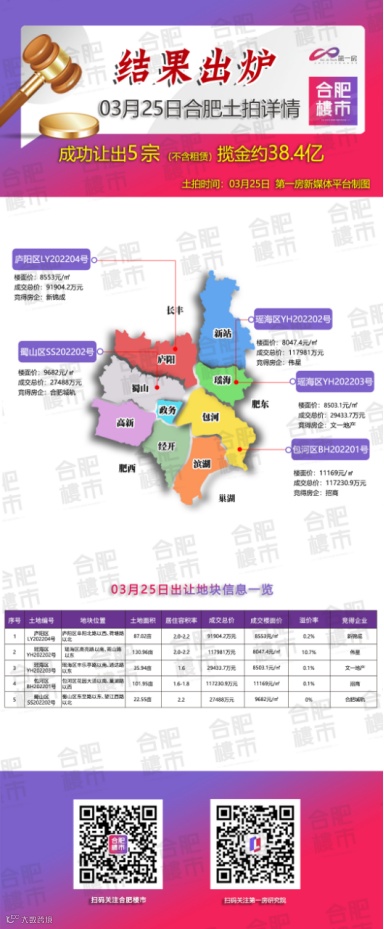 导读:3月第二场土拍落幕,7宗地块总揽金39.12亿余元。此次土地拍卖中,5宗涉宅地分别来自蜀山、包河、庐阳供地。