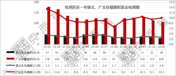 包河区近3年年均成交117万方,2021年主力成交集中在淝河与工业园板块,域内截止到2022年1月狭义库存30万方,狭义去化周期2.8个月(计12个月),广义库存106万方,去化周期10.1个月(计12个月),整体区域购买力强劲。