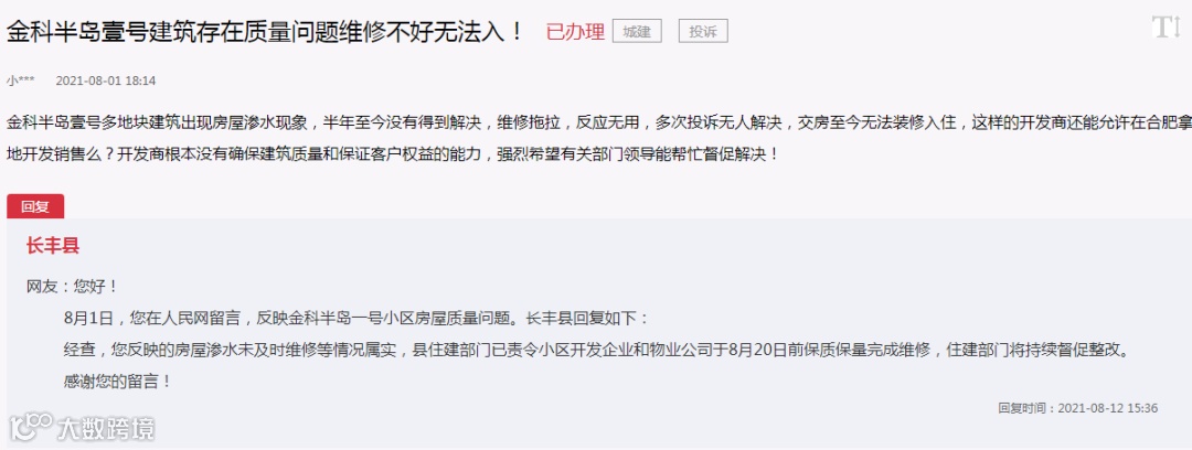 近日,有网友在人民网领导留言板反映长丰县金科半岛壹号建筑质量问题,详情如下: