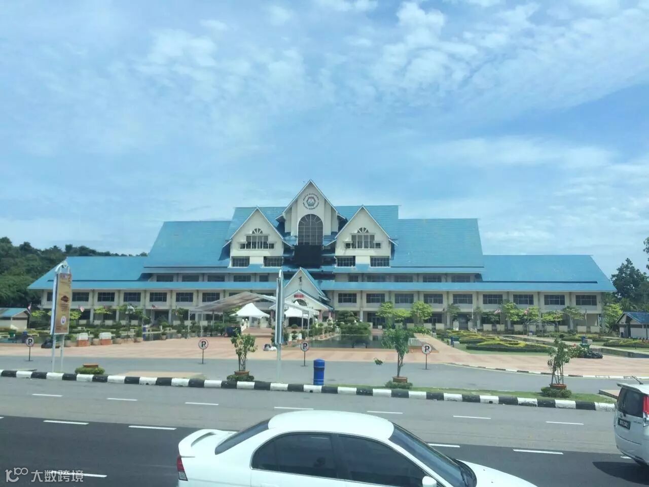 离粉红清真寺不远处便是马来西亚的首相署。这座很有特色的绿色圆顶建筑在蓝天白云的映衬下显得十分庄严雄伟。