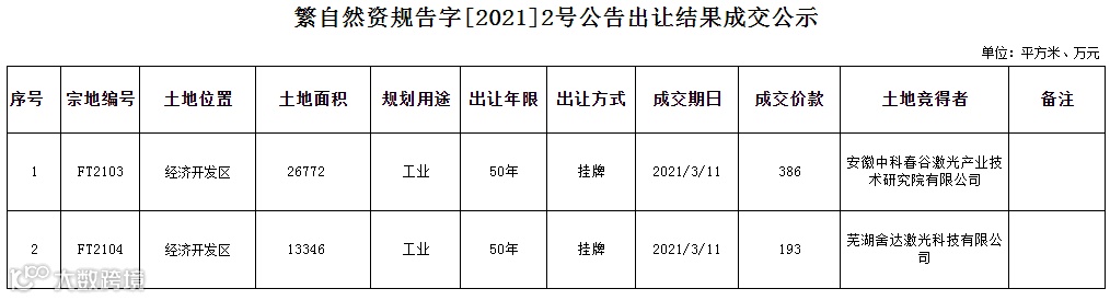 FT2103号地块由安徽中科春谷激光产业技术研究院有限公司竞得,FT2104号地块由芜湖舍达激光科技有限公司竞得。