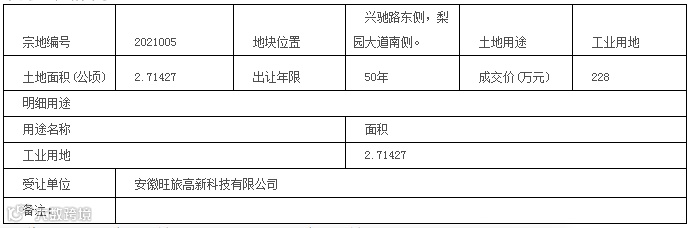 该地块位于兴驰路东侧,梨园大道南侧,由安徽旺旅高新科技有限公司竞得。