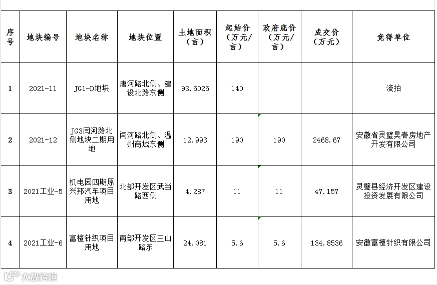 位于北部开发区武当路西侧的2021工业-5号地块和位于南部开发区三山路东的2021工业-6号地块分别由灵璧县经济开发区建设投资发展有限公司和安徽富檀针织有限公司竞得。
