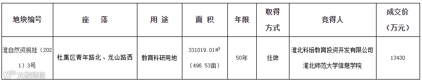 淮北市淮自然资规挂(2021)3号地块使用权成功出让,该地块为教育科研用地,出让年限50年,竞得单位为淮北科培教育投资开发有限公司淮北师范大学信息学院。