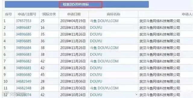 通过查询得知:到目前为止斗鱼共申请注册500件商标,包括“斗鱼”、“斗鱼 DOUYU.COM”、“DOUYU”、“鲨鱼街”、“逗鱼时刻”、“斗鱼城”、“鱼翅”“斗鱼 TV”及鲨鱼图形等商标。