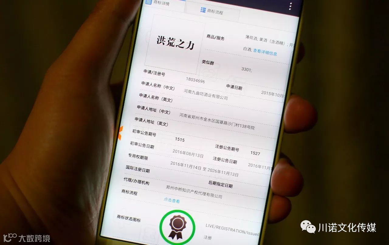 一年后的2016年11月14日,国家工商总局给出商标申请核准注册,河南九曲坊酒业有限公司申请“洪荒之力”商标33类成功。俞春永拿到了商标证书。