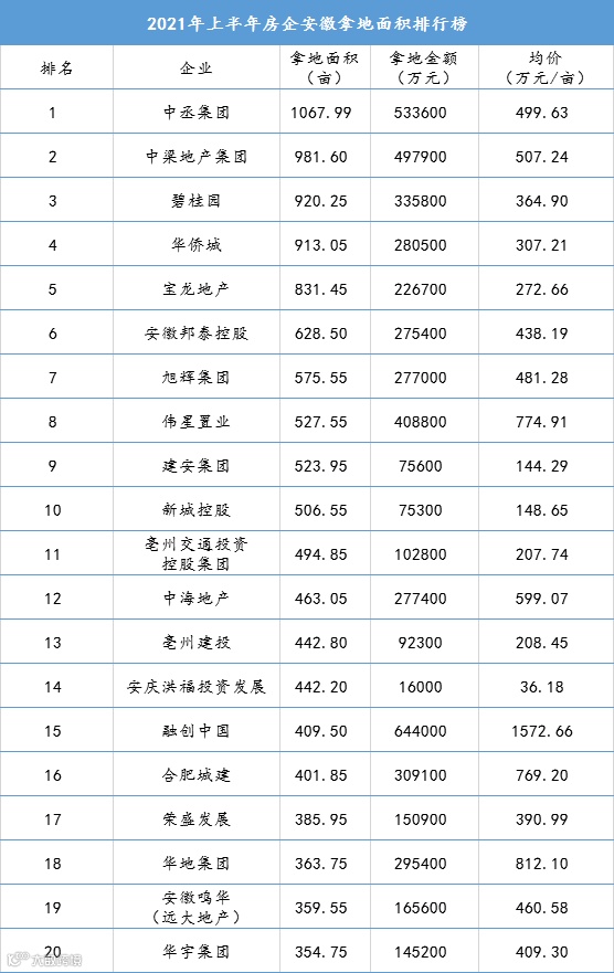 今年1-6月,安徽房地产企业拿地面积榜单大洗牌。