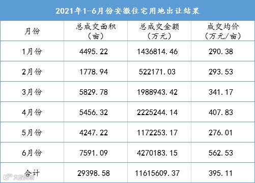 2021年1-6月安徽土地成交“量跌价涨”