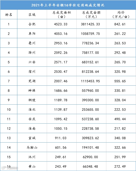 阜阳此次虽然成交面积位居全省第二、但是均价却仅有261万元/亩,这可能与县域地块成交面积较多有关。