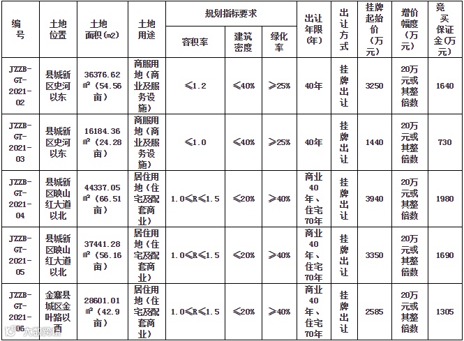 六安市金寨县将出让5宗土地使用权,位于县城新区史河以东的2宗为商服用地(商业及服务设施),其余3宗为居住用地(住宅及配套商业)。