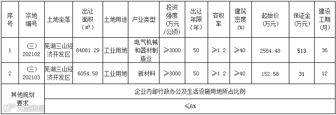 芜湖市自然资源和规划局决定挂牌出让三山经济开发区2宗工业用地使用权,分别用于发展电气机械和器材制造业和新材料工业。