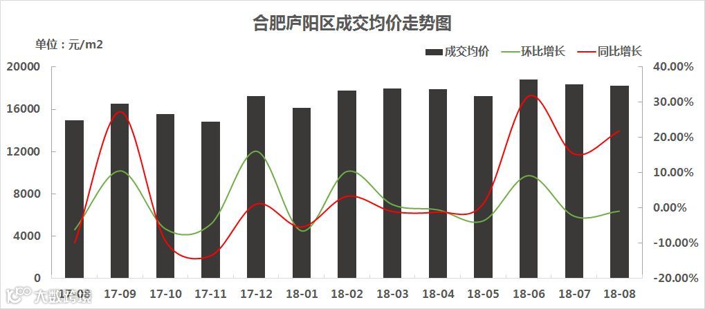 2018年8月份,庐阳区成交均价为18219.83元/㎡,环比微跌0.89%,同比增长21.81%。