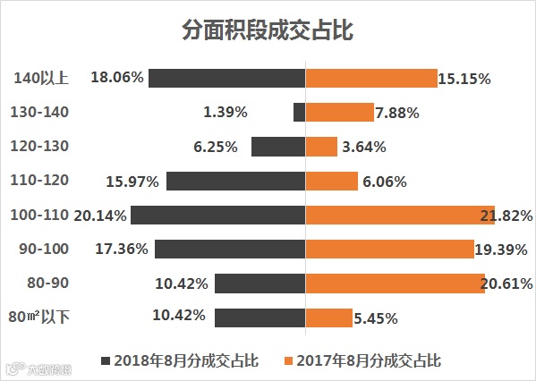 从分面积段成交来看,90-110㎡的房源成交占比37.50%,是销量最多的面积段。由此可见,庐阳区已经成为刚需群体首选的住房区域之一。其次是140㎡的改善性房源,占比为18.06%。