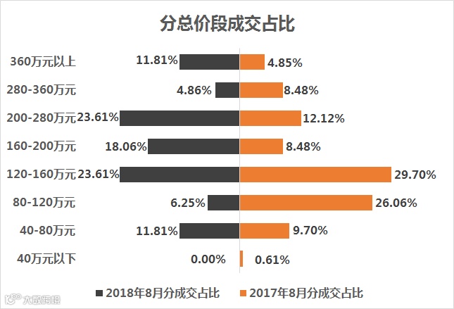 从价格段来看,总价120-160万元和200-280万之间的产品成为成交主力,分别占比23.61%。