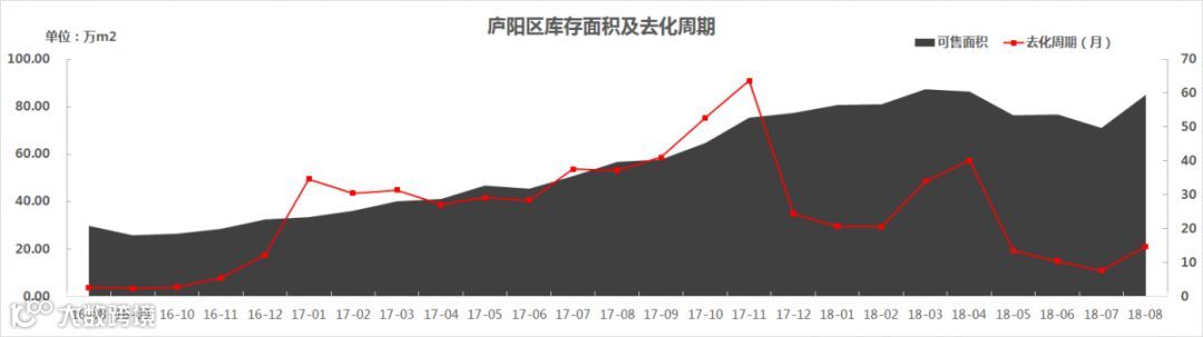 截止2018年8月31日,庐阳区的商品住宅可售量为6951套/84.86万㎡ ,库存面积环比上涨19.47%。去化周期为14.7个月,较7月份上涨7.1个月(该数据以备案为准,不排除实际售出、在等备案的房源数据)。