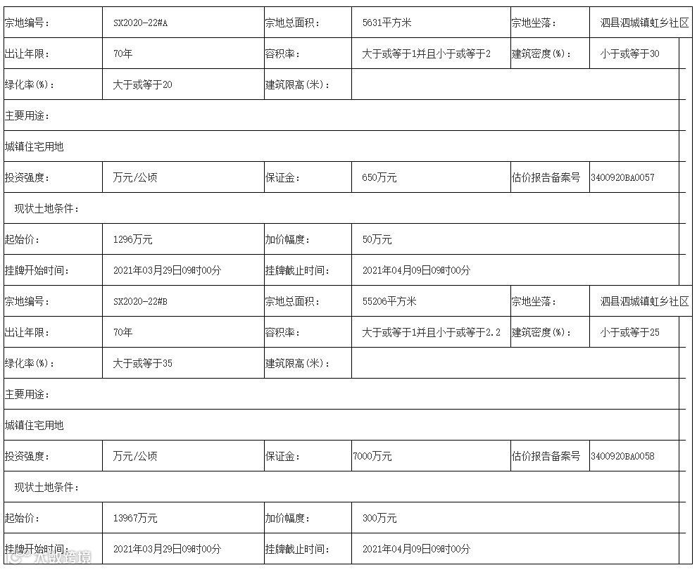 宿州市泗县自然资源和规划局决定以挂牌方式出让2宗地块的使用权,2宗地块均位于泗县泗城镇虹乡社区,用途为住宅用地,使用权出让年限为70年。