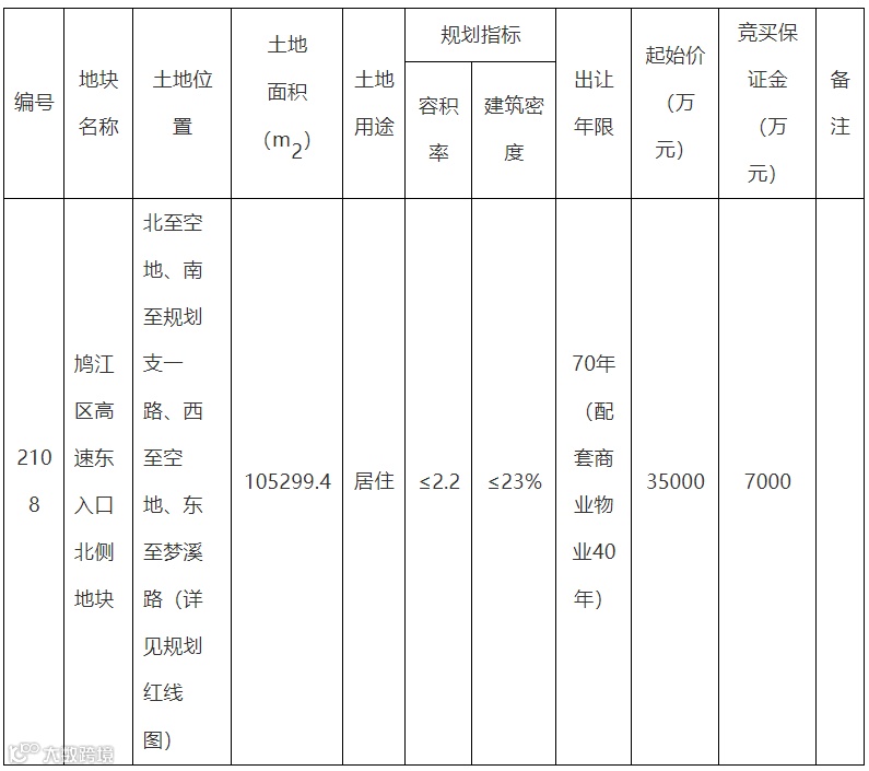 芜湖市公共资源交易中心消息,芜湖市自然资源和规划局决定以拍卖方式出让鸠江区高速东入口北侧2108号地块的使用权,地块面积约105299㎡,规划用途为居住用地,使用权出让年限为70年,配套的商业和物业用地使用权出让年限为40年。