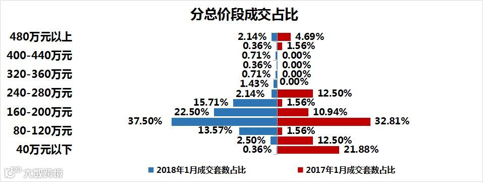 从价格段来看,市场以总价120-160万元之间的产品为成交主力,占比37.5%,占比同比增加4.69%。