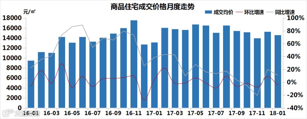 2018年1月,高新区的住宅市场呈“量价齐跌”,供销比为2.02,住宅市场明显供大于求,房价跌至14587.67元/㎡,两盘拉低均价。