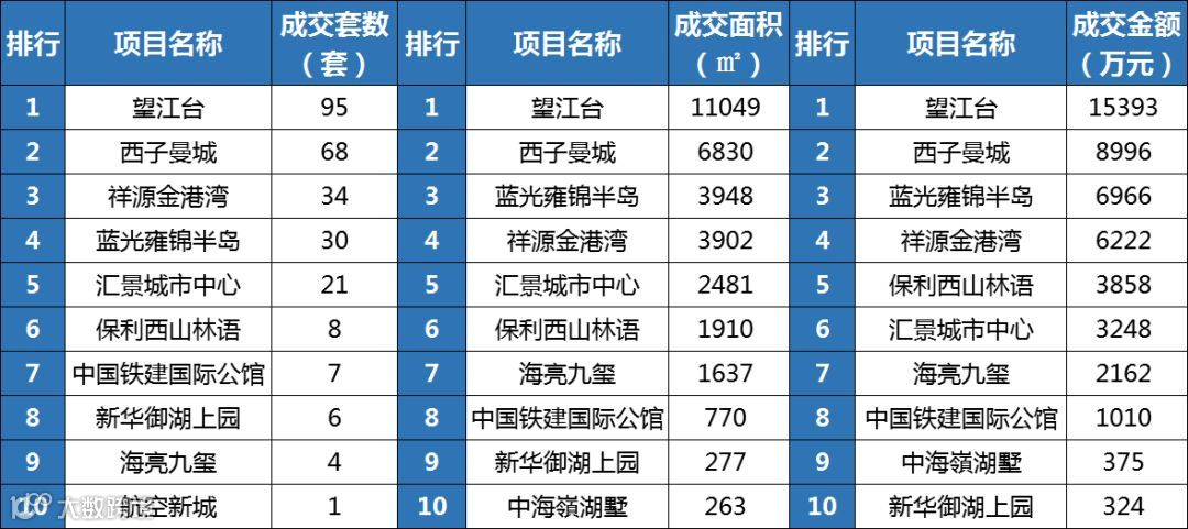 2018年1月,望江台以95套/11049㎡、15393万元的销售额夺三料(销售套数、面积和金额)冠军;西子曼城居排行榜第二,共成交68套/6830㎡,销售额为8996万元。