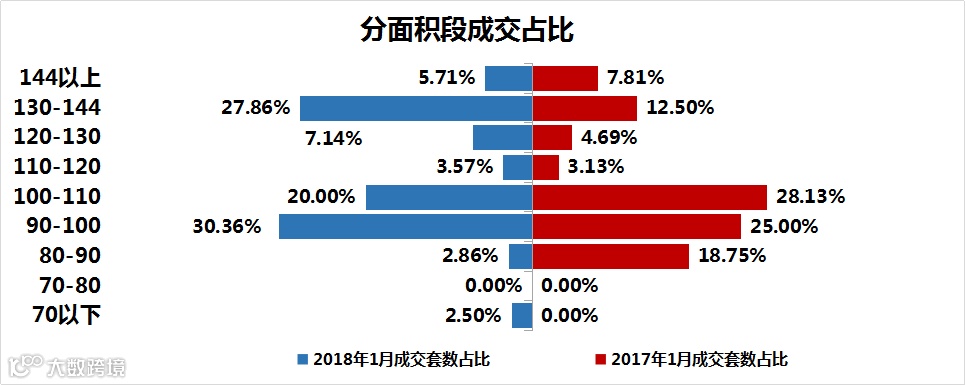 从分面积段成交来看,90-100㎡的房源成交占比30.36%,是销量最多的面积段,其次是130-144㎡的户型,占比27.86%。